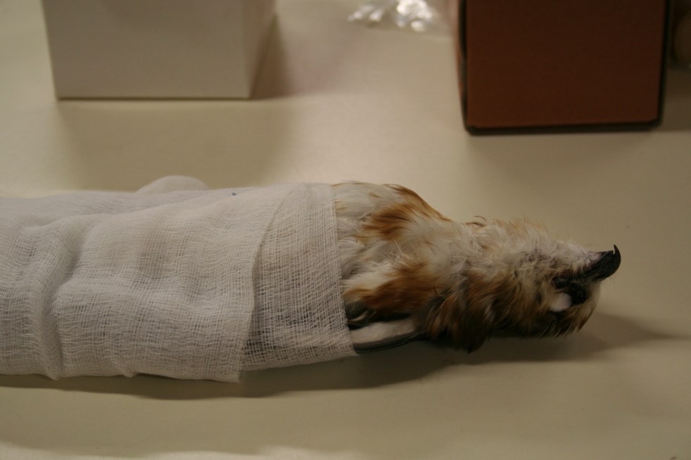 Finished grooming the outer skin, I insert a measured length of dowel up through the neck and into the cervical cavity at the base of the skull, around which I wind cotton wool and then Dacron, or mattress-stuffing, which puffs out under the skin, plumping like tissue and giving a lifelike appearance. I then thread a needle and begin to stitch the incision running from clavicle to cloaca–the dual purpose opening through which the bird passes reproductive material and waste. I cross its feet at the ankles and use string to tie them around the dowel rod. A label is attached to the string, identifying the bird by scientific name, location, date, and specimen number, all corresponding to details recorded in the zoological register. Fine surgical gauze is then mummy-wrapped around the bird, beginning at the shoulders and moving down to the tail, to enable it to ‘set’ and dry, a process which takes about three weeks. After this, the specimen will keep its shape and can be stored flat in a collection drawer.