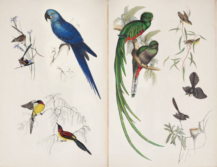 Very generously, The Queensland Museum library granted me permission to photograph an original plate, from the Goulds’ Monograph of the Trogonidae, or Family of Trogons (1835-1838). The monograph, superseded by a second edition in 1858, is extremely rare, with only two copies held in Australian libraries. The resplendent quetzal, notoriously difficult to encounter in its natural habitat, proved a challenge to photograph, requiring many adjustments of position and lighting to adequately render its brilliance. With the patience and assistance of librarian Meg Lloyd, and the the perseverance of my photographer, Vikki, after several hours, we finally succeeded.